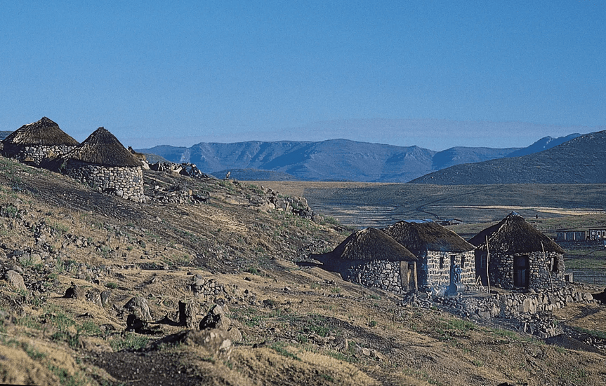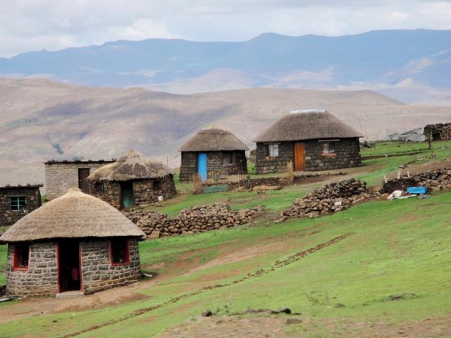 The highland regions of Lesotho, including the Maloti and Drakensberg ranges, are home to much of the population and serve as centers of Basotho cultural identity. Traditional villages are often located on hillsides or ridges for defense and better grazing access. Dwellings are typically simple round huts called mokhoro, constructed of stone or mud with thatched roofs, and are clustered together in small settlements. Because level ground is scarce in the mountains, terracing is used to create fields along slopes and valleys. The main subsistence crops include maize and sorghum, planted during the summer rainy season, while vegetables are grown in home gardens. In many areas, households also grow beans and potatoes as staple or cash crops suited to the cool climate. Livestock rearing, especially of sheep and goats, is an important complement to crop farming, providing wool, mohair, meat, and income. Some herders practice transhumance, seasonally moving flocks to high-altitude grazing areas during summer and returning to lower elevations in winter, where they stay in temporary stone shelters or huts built near grazing land.