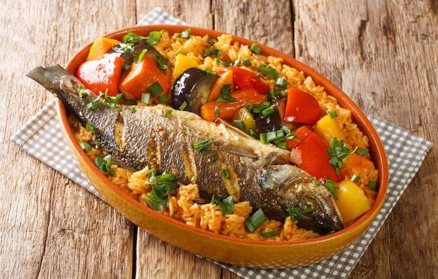 Mauritanian cuisine blends Arab, Berber, and West African influences, featuring hearty dishes often centered around meat, grains, and spices. One of the most popular national dishes is thieboudienne (or chebujin), a flavorful mix of fish, rice, and vegetables cooked in tomato sauce. Mechoui, or roasted lamb, is commonly prepared for special occasions, while mafé, a peanut-based meat stew, reflects regional culinary ties with neighboring Senegal and Mali. Couscous is also widely eaten, usually served with vegetables and meat. Green mint tea is an essential part of social life, served multiple times a day in a ritual that symbolizes hospitality and friendship. Meals are typically shared from a communal dish, reinforcing family and community bonds.