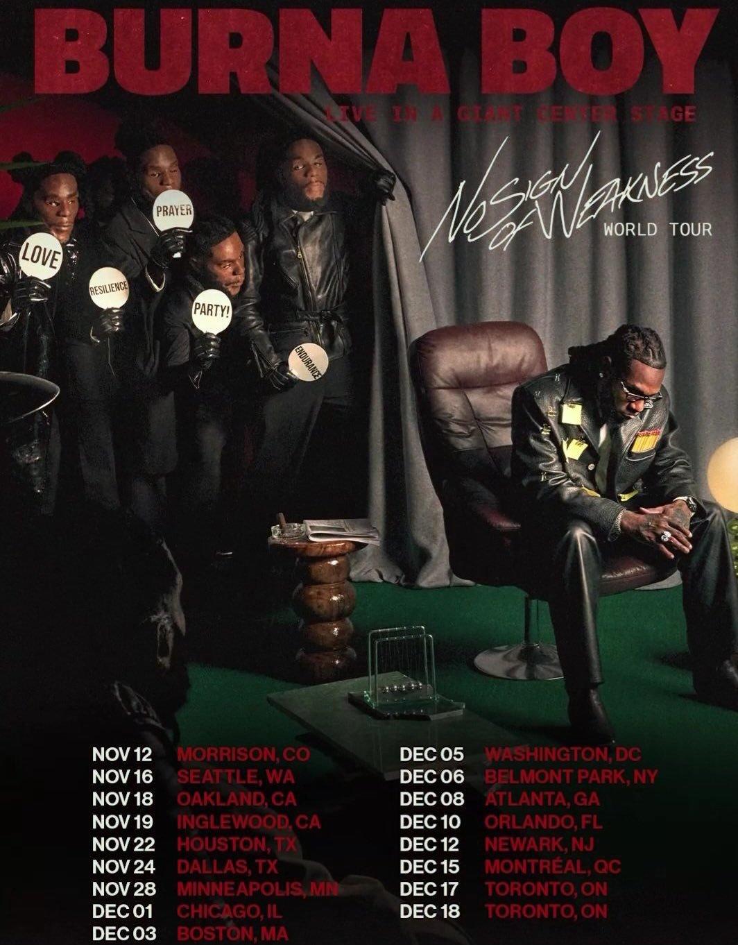 In November, Burna Boy begins a 16-city North American tour supporting No Sign of Weakness. He’ll headline the iconic Red Rocks Amphitheatre and deliver the remainder of his shows on a 360° stage, offering immersive experiences across major cities like Chicago, Toronto,
