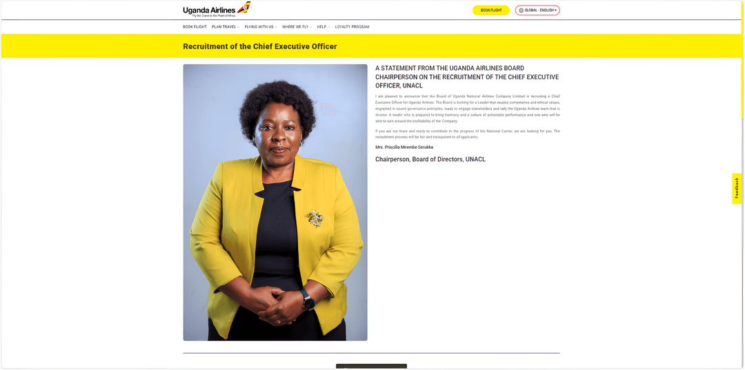 Uganda Airlines, the national carrier of Uganda, is currently under intense scrutiny regarding governance issues as Chief Executive Officer Jenifer Bamuturaki's leadership faces significant challenges. The airline's board has decided to re-advertise the CEO position, effectively ending her tenure.