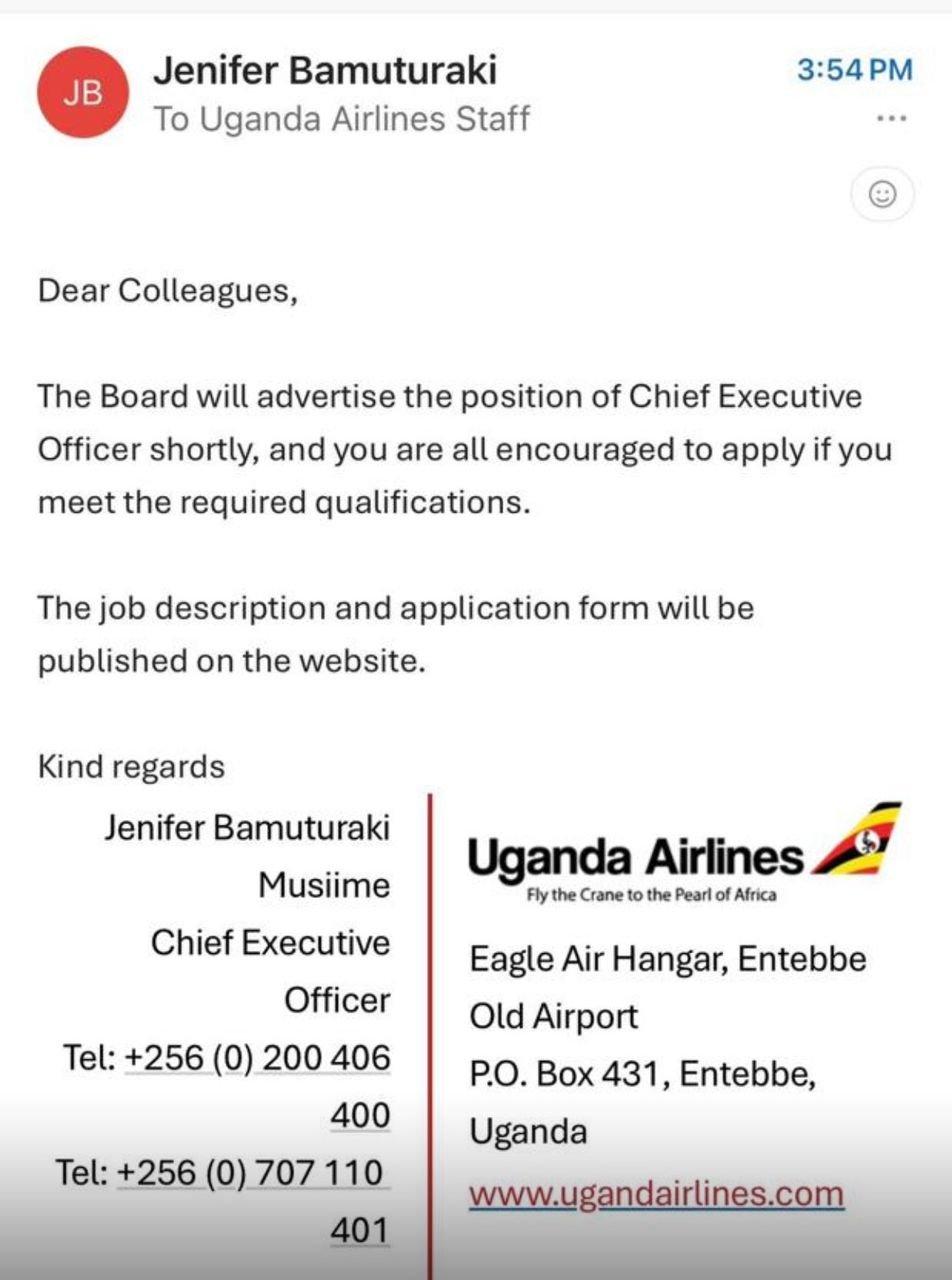 In an internal communication sent to staff on February 2, 2026, Bamuturaki announced that the board resolved to open her position for public applications. She encouraged qualified employees to apply once the job description is posted.