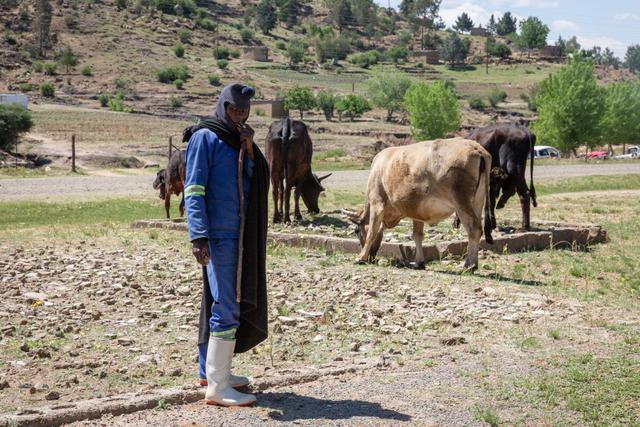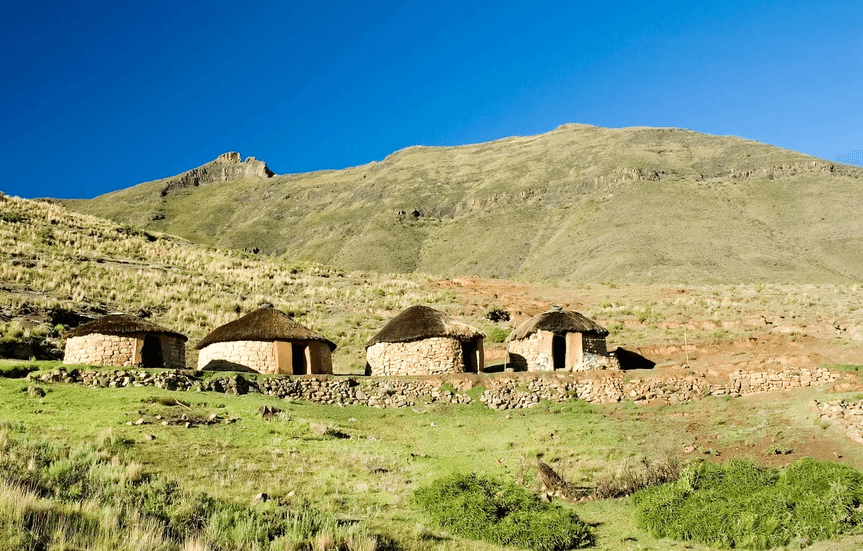 The highland regions of Lesotho, including the Maloti and Drakensberg ranges, are home to much of the population and serve as centers of Basotho cultural identity. Traditional villages are often located on hillsides or ridges for defense and better grazing access. Dwellings are typically simple round huts called mokhoro, constructed of stone or mud with thatched roofs, and are clustered together in small settlements. Because level ground is scarce in the mountains, terracing is used to create fields along slopes and valleys. The main subsistence crops include maize and sorghum, planted during the summer rainy season, while vegetables are grown in home gardens. In many areas, households also grow beans and potatoes as staple or cash crops suited to the cool climate. Livestock rearing, especially of sheep and goats, is an important complement to crop farming, providing wool, mohair, meat, and income. Some herders practice transhumance, seasonally moving flocks to high-altitude grazing areas during summer and returning to lower elevations in winter, where they stay in temporary stone shelters or huts built near grazing land.