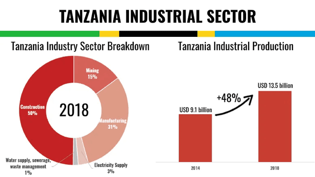 The manufacturing sector in Tanzania is growing steadily, focusing on food processing, beverages, textiles, leather products, and construction materials. Key industries include cement, sugar, tobacco, and chemicals. Efforts are being made to attract foreign investment and boost industries such as agro-processing and pharmaceuticals to support local production and exports.